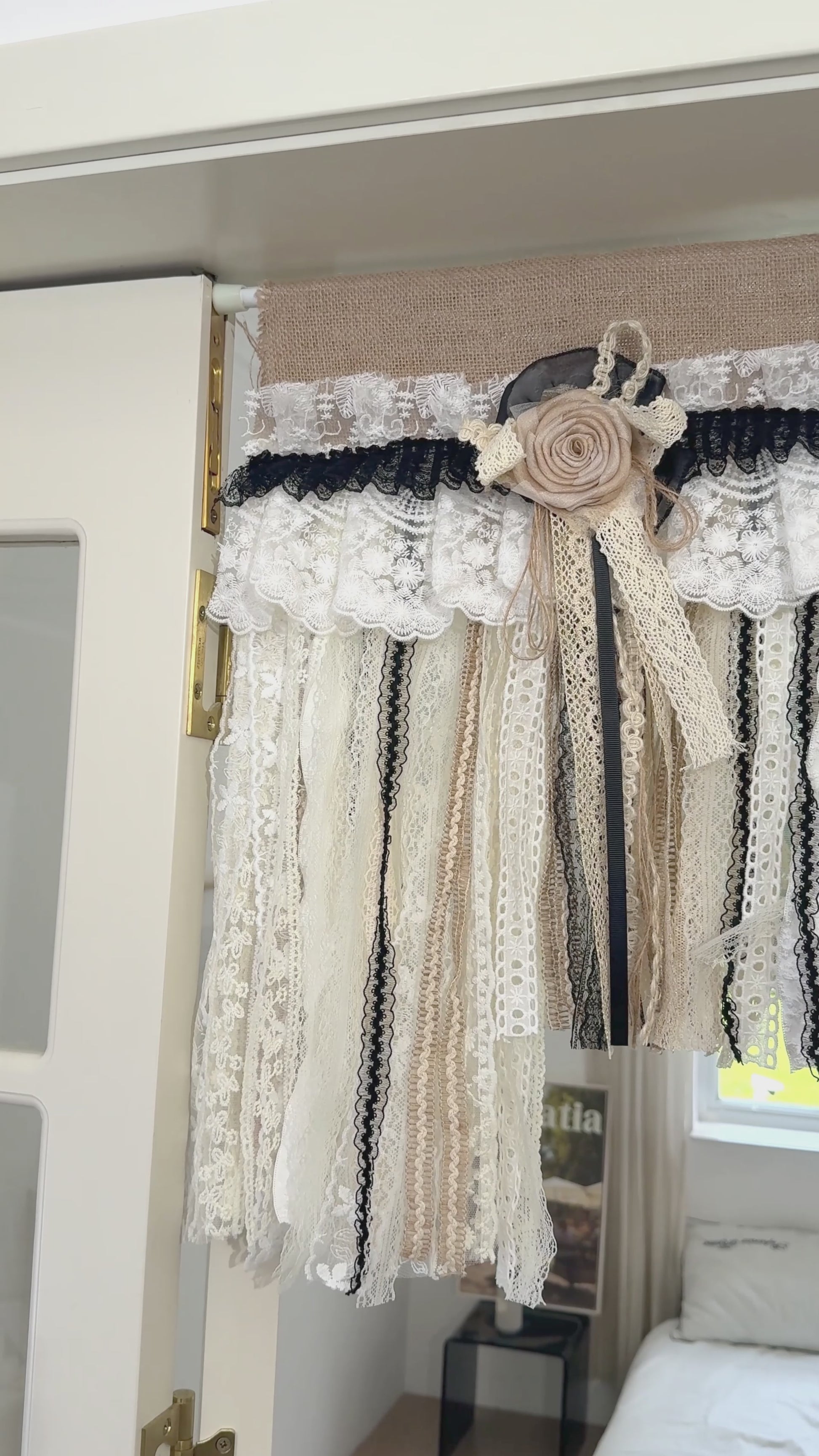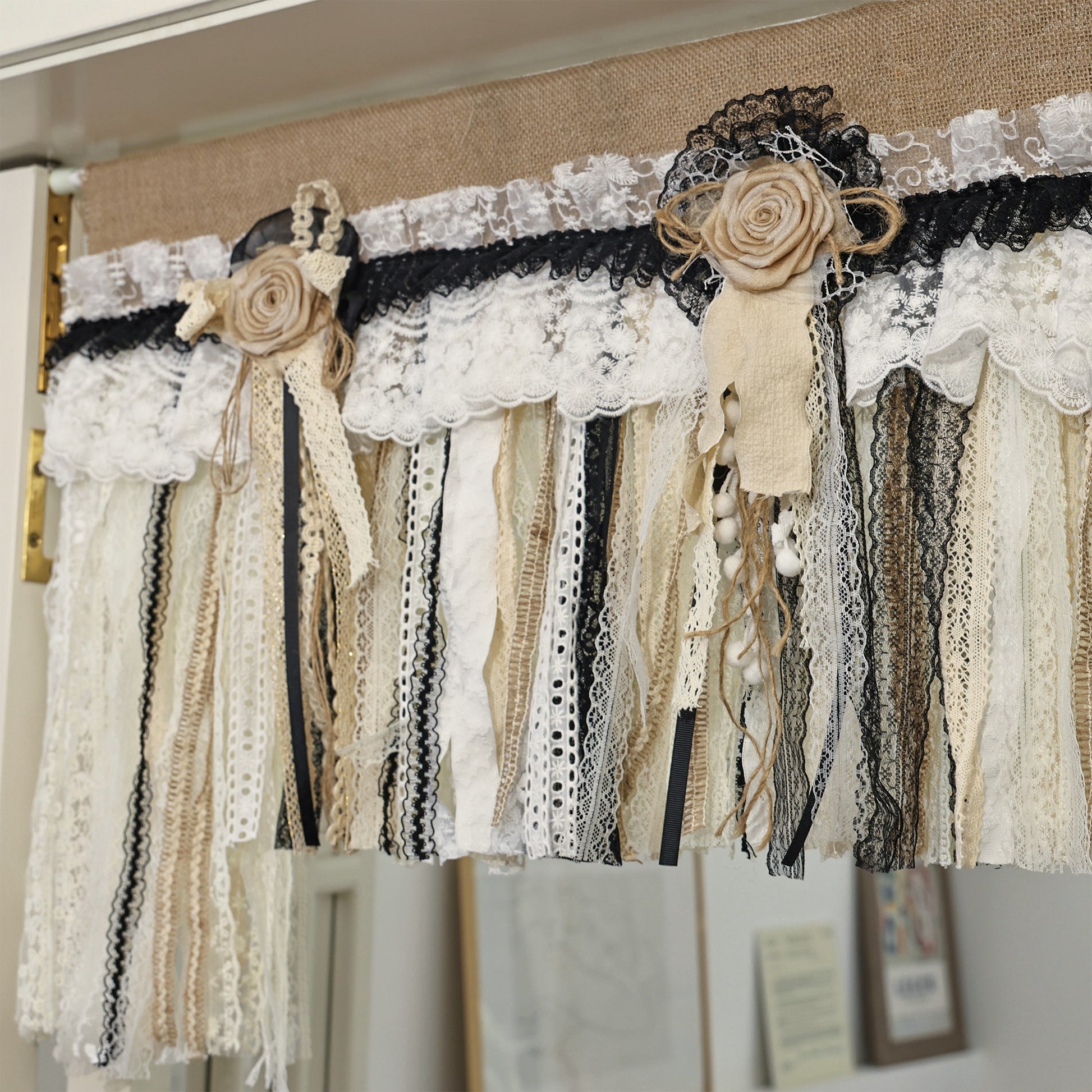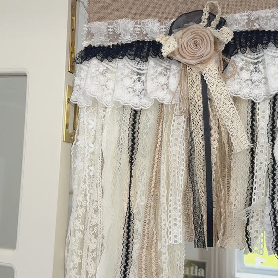 Rustic Unique Burlap Beige Black Lace Swag Window Curtains Valance